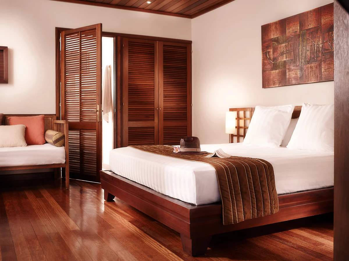 bungalow Tropique20 bungalows de 34 m², pouvant accueillir 2 adultes et 2 enfants et 1 bébé surplombant les jardins luxuriants, avec parquet et boiseries pour une atmosphère tropicale.
